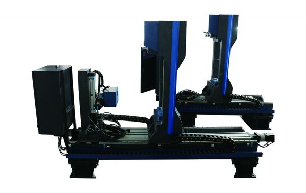 該套設(shè)備是我公司為中國石油集團渤海鉆探工程有限公司研制的鉆桿專用測量設(shè)備,設(shè)備分為外螺紋側(cè)測量裝置和內(nèi)螺紋側(cè)測量裝置兩部分。其中外螺紋部分設(shè)置2組雙測頭,測量鉆桿接頭外徑尺寸,同時通過測頭部分滑臺的行走距離和尺寸變化設(shè)定,測量外螺紋部分接頭的長度。內(nèi)螺紋部分設(shè)置2組雙測頭和1只二維激光測量傳感器,雙測頭測量鉆桿接頭外徑尺寸,同時通過測頭部分滑臺的行走距離和尺寸變化設(shè)定,測量內(nèi)螺紋部分接頭的長度。二維激光測量傳感器掃描測量內(nèi)螺紋端部的壁厚尺寸。